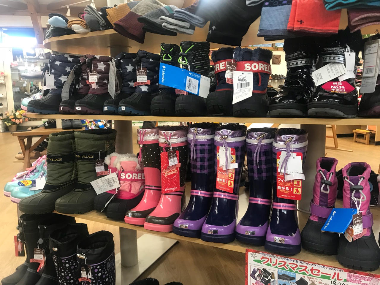 2019年12月17日 クリスマスセール開催中です スパイク付きスノーブーツ、長靴など、お買い得となっております!お子様用スノーブーツは20足限定でなんと半額です。人気ブランド「SOREL」や「瞬足」のブーツも半額となっておりますのでこの機会にお見逃しなく!※ クリスマスセールは 12月30日まで5,000円(特価品除く)以上お買い上げの先着50名様に、田澤農園のシクラメンをプレゼントさせていただきます!